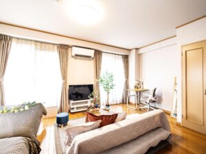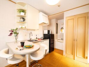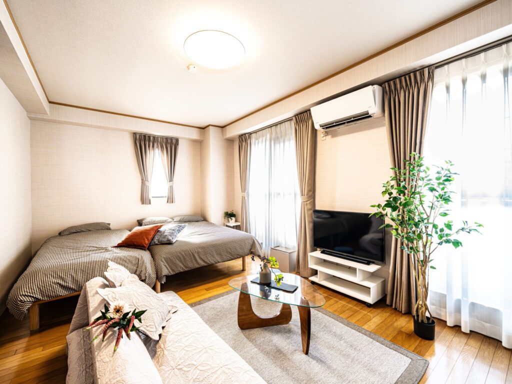 ダブルベッドとシングルベッドをバランスよく配置した、ゆとりを感じられる広めのワンルームです。家具・家電はもちろんのこと、使い勝手を重視したレイアウトにより、初めて訪れる方にも“自宅のような安心感”を感じていただけます。
